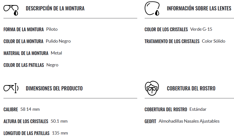 Con su clásica montura dorada, podrás ver el mundo a través de una gama de colores distintos gracias a la variedad de lentes de las que dispone, como cristal marrón, cristal verde, G-15 polarizado y otros tratamientos que proporcionan una nitidez visual óptima y el 100% de protección contra los rayos ultravioleta.