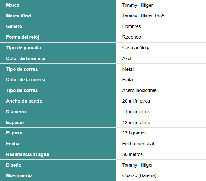 El Tommy Hilfiger 1792185 es un reloj analógico de cuarzo para hombre, de estilo deportivo y moderno, con caja y correa de acero inoxidable plateado, fondo azul marino, bisel azul verdoso y resistencia al agua hasta 5 ATM (50 metros), ideal para uso diario y con funcionalidades de cronógrafo/multifunción.